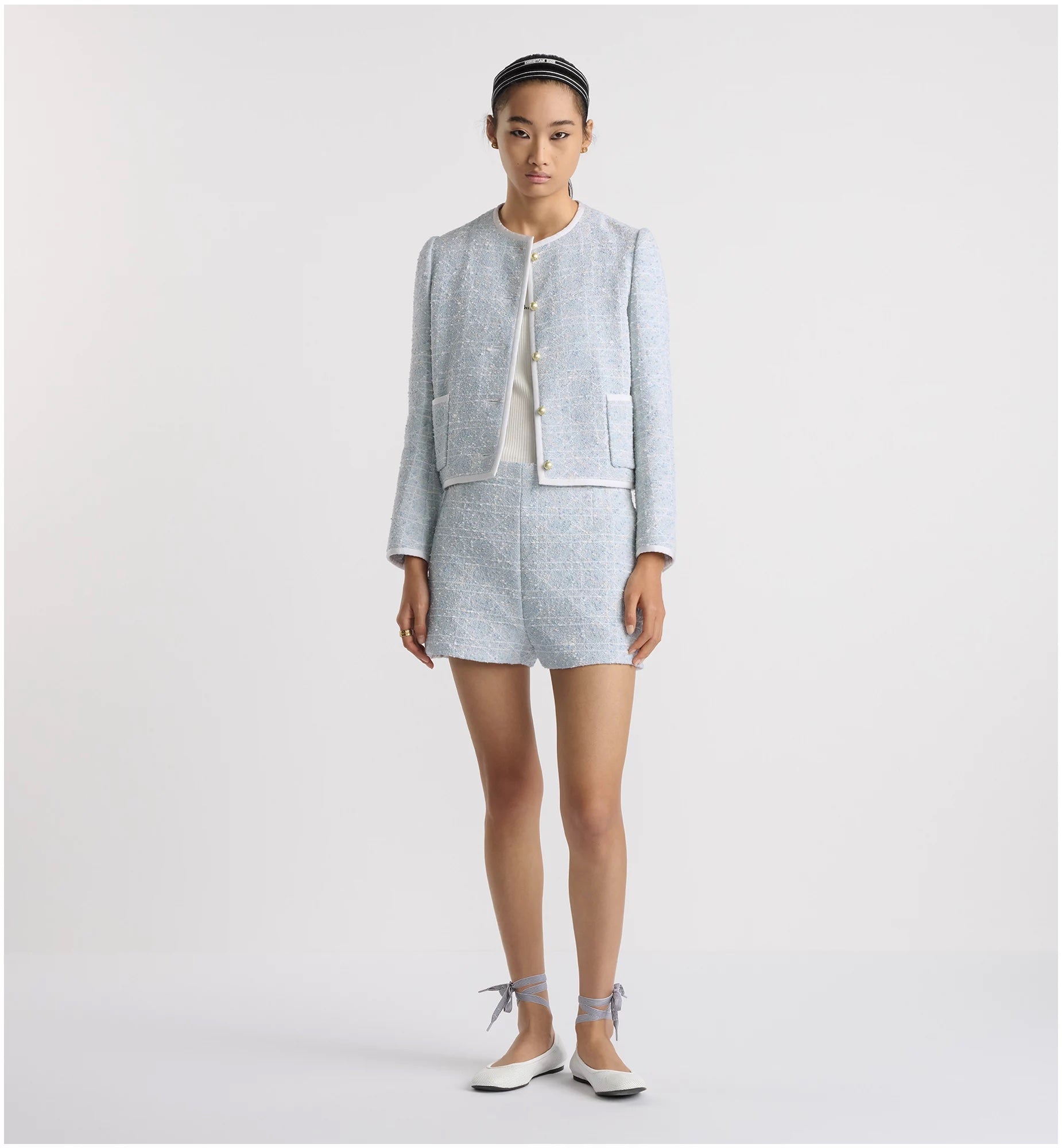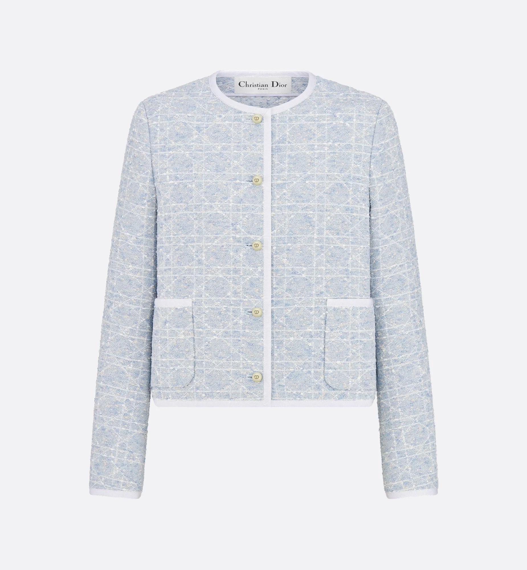The cropped jacket offers a modern take on Dior's codes of elegance. Crafted in cotton-blend tweed with a sky blue Macrocannage motif, it features a cropped, regular-fit silhouette adorned with Dior Tribales buttons showcasing a CD resin pearl inspired by the iconic House earring. Embellished with patch pockets and contrasting white grosgrain, the jacket may be paired with the matching shorts to complete the look.