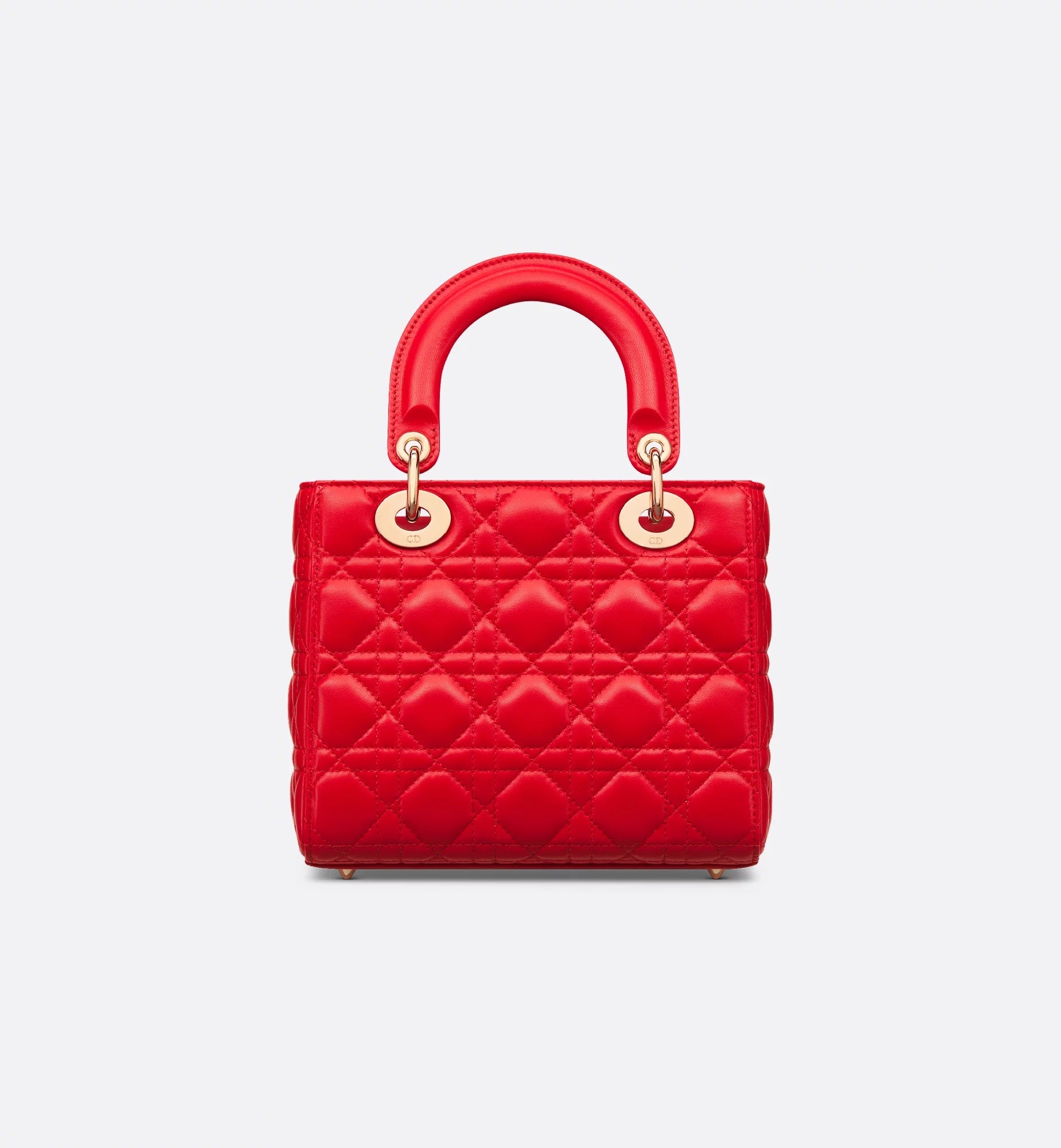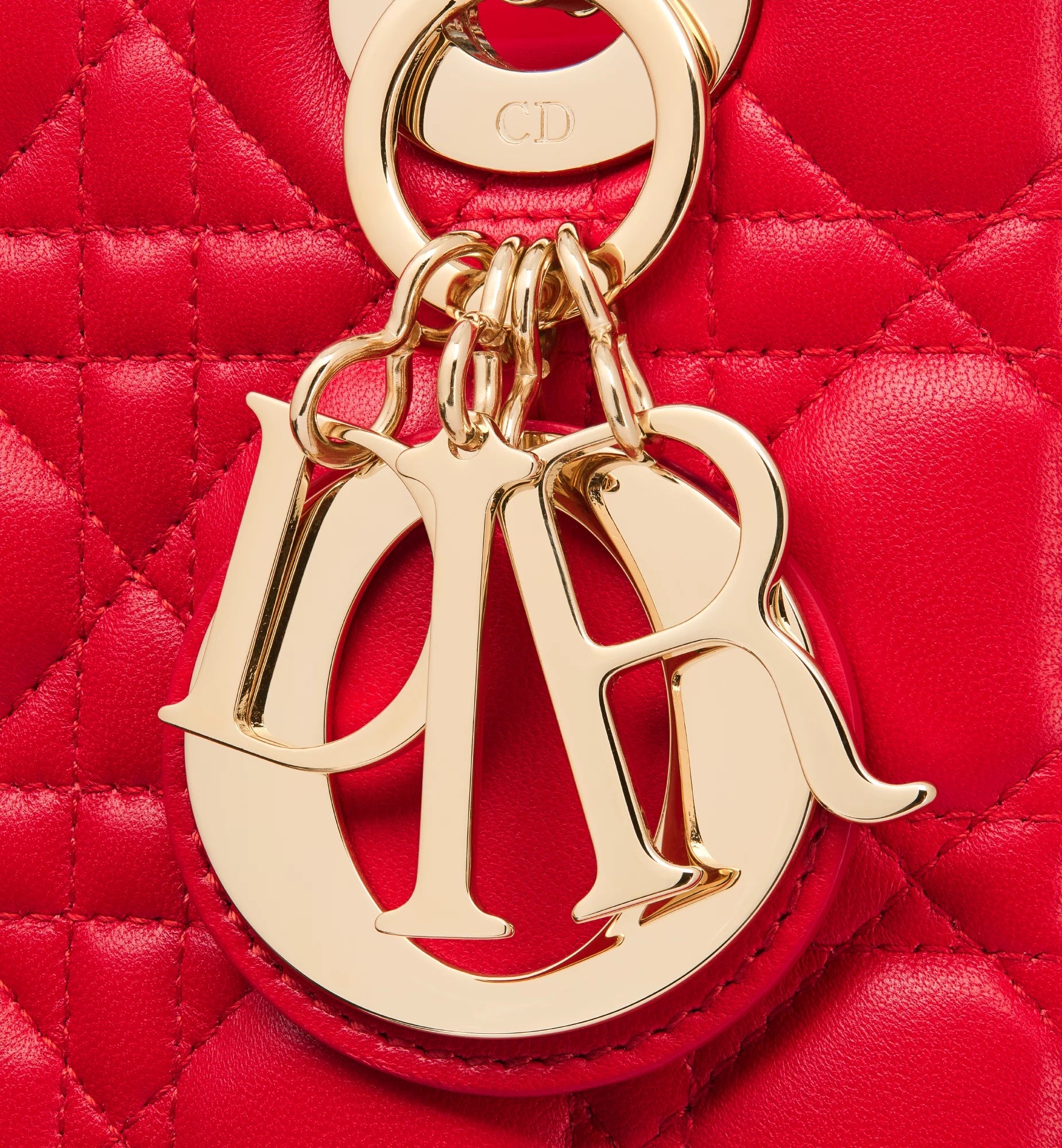 The Lady Dior My ABCDior bag epitomizes Dior's vision of elegance and beauty. Sleek and refined, the timeless style is crafted in bright red lambskin with Cannage stitching, creating the unmistakable quilted texture. Pale gold-finish metal D.I.O.R. charms offer elegant appeal. Featuring a strap that can be personalized with badges, the small, unique design may be carried by hand or worn crossbody.